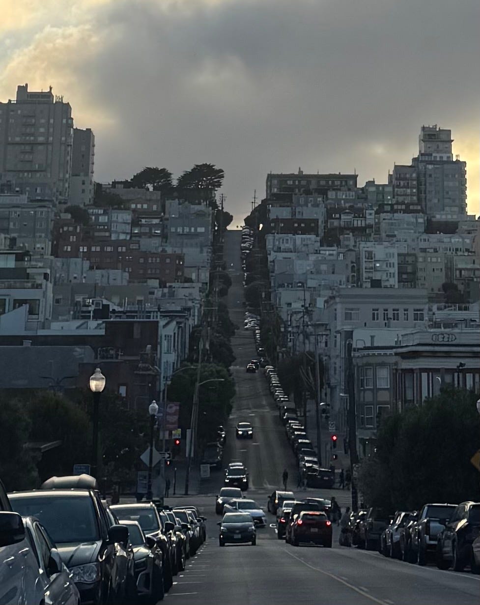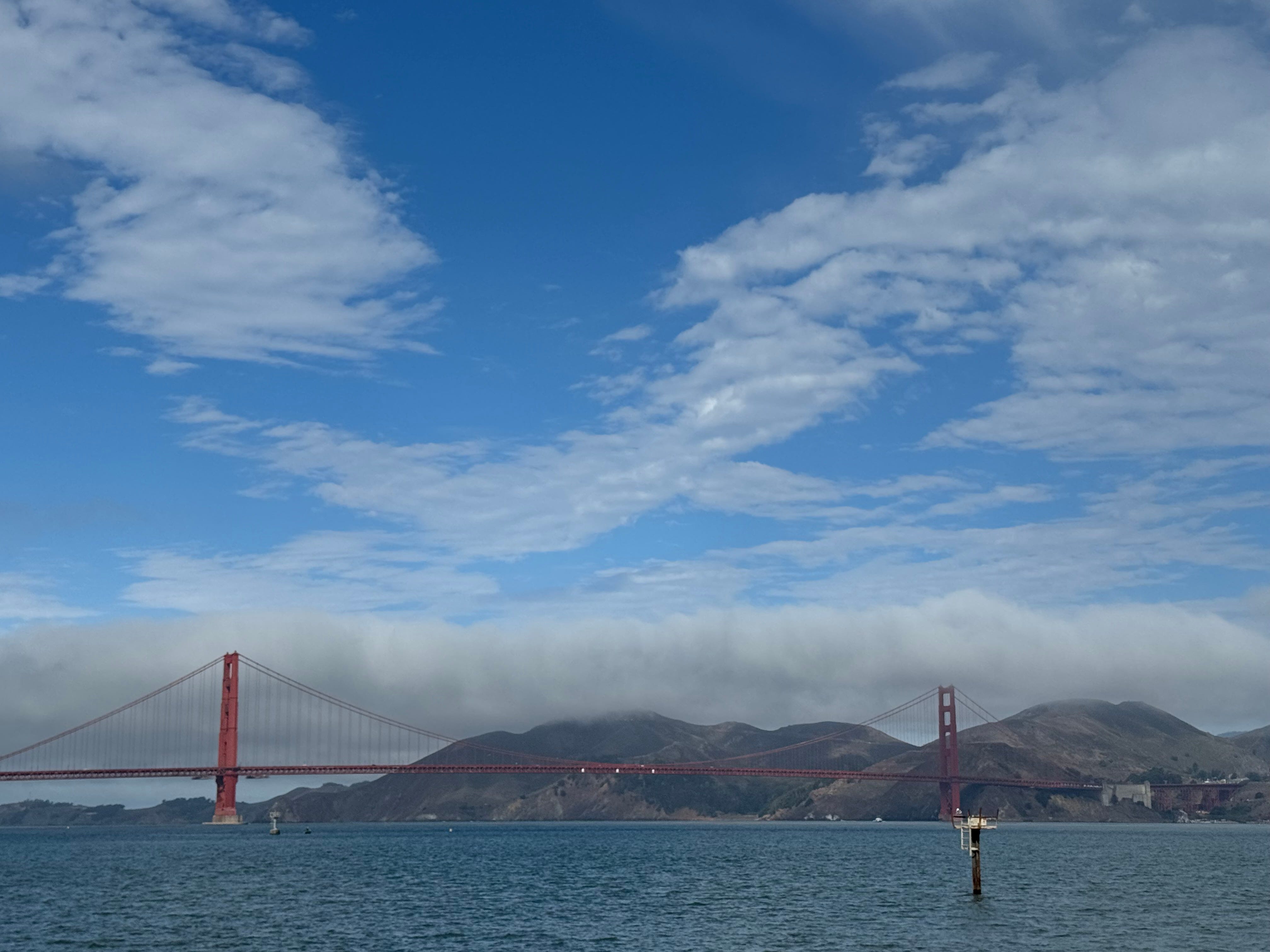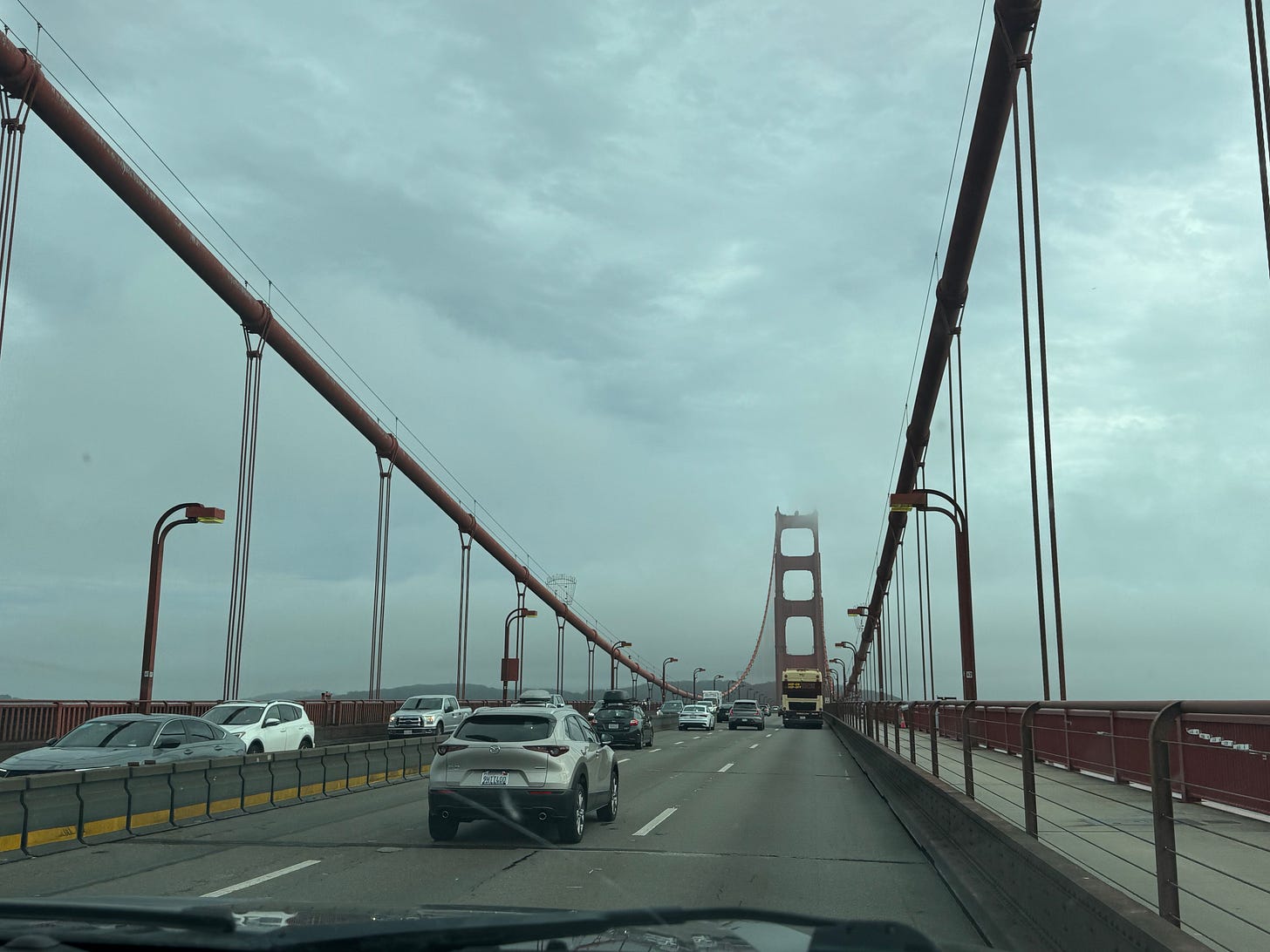 with our bellies full, we got back on the road. We still had to get to San Francisco. We originally intended to stay along the coast most of the way, but the navigation reverted to its very helpful algorithm. This took us on the faster interior route without bothering to ask us first. Oh well, pay better attention next time. We got to San Francisco in good time, crossing the Golden Gate Bridge a little after 5 pm.