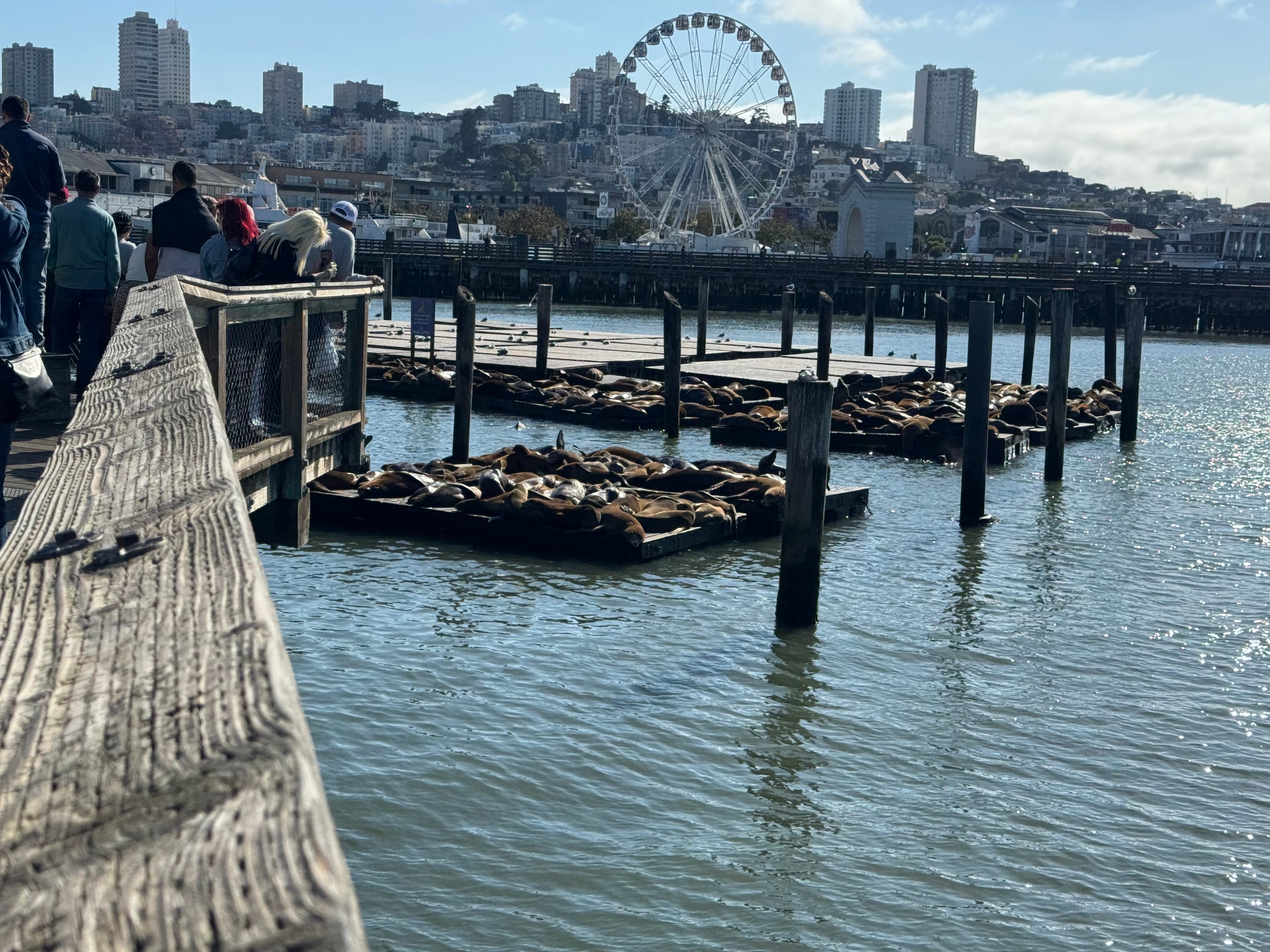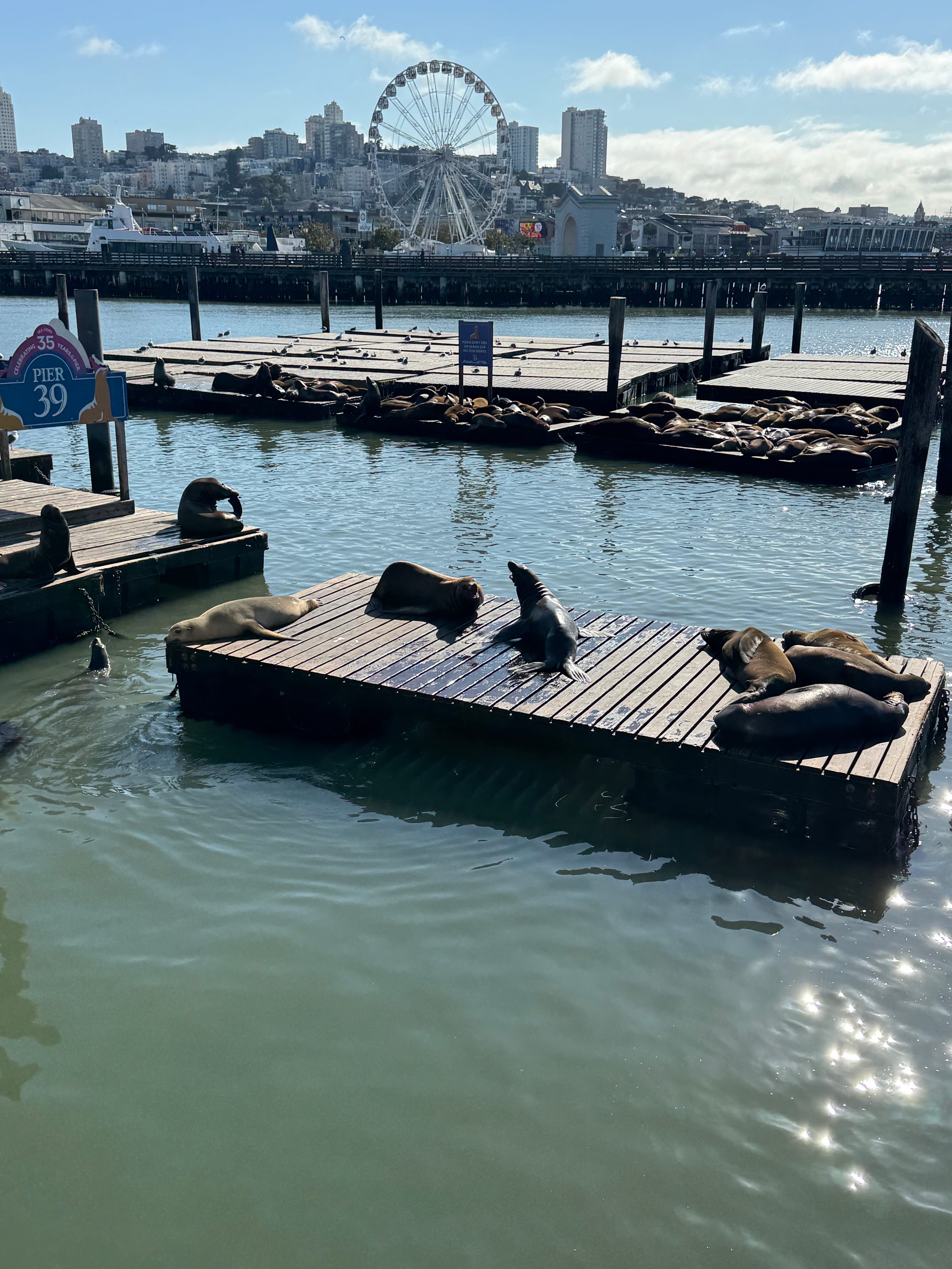 We walked a couple of blocks to pickup the street car for Pier 39, (it was two miles from the hotel and I didn’t have the desire for more walking). I made up for that at the end of the evening however. We got to Pier 39, walked through the tourist traps of small shops, the traditional tourist eateries etc. We stopped at a locally owned place, (it was happy hour) and had a beer while we decided what to do. After a beer and a really good crab cake, we left and found the area where the Sea Lions basked and made a ruckus for the tourists. It was fun to see them and watch their antics! We settled on a local restaurant, locally owned, several blocks from the Pier 39 area. Betty Lou’s Seafood and Grill was the winner tonight! Lori had a very good Seabass and I had a fantastic Ciopinno. We took our time and enjoyed a leisurely dinner. The plan was to take the bus back to near the hotel. However, in my comfort of a full belly I didn’t set the map to “bus” so we walked a few miles back to the hotel. I felt I like I was put on a punishment ruck march, by me! We only went through a few dark, sketchy looking areas, but made it back in one piece.